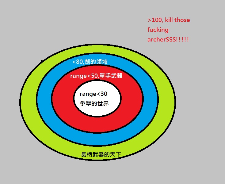 Billhook有著比起同類pole-arms略高的速度(55%),但很不幸的,它攻擊範圍卻從高高在上的Pole-Arms(Range:80~100)進了長劍、巨劍兩虎相爭的險惡之地(Range:60~70),以至於讓它多出那5%的速度相形之下幾乎沒有發揮的空間。讓我用一張圖片來說明,會比較容易讓人理解,Billhook在距離上的地位,有多麼尷尬與難堪。